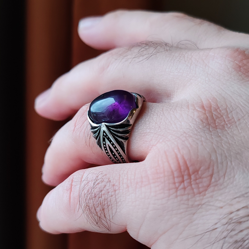Ametist, mor kristal dokusuyla her takıda farklı bir ışık oyunu sunar. Renk yoğunluğu taşın yapısına göre değişir, bu da yüzüğü tamamen tek ve özgün bir parça yapar. Stilini zarafet, güç ve modernlikle tamamlamak isteyen erkekler için ideal bir tercihtir.