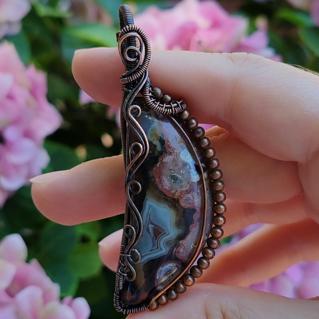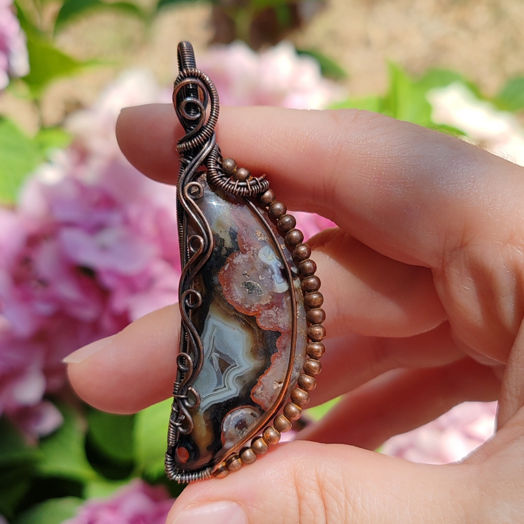 Doğal Agat taşı, bakır tel sarma el işçiliğiyle özenle sarılarak benzersiz bir kolyeye dönüştürüldü. Taşın içinde oluşan doğal desenler, adeta minyatür bir manzarayı andırır—her biri doğanın kendi çizimidir ve tamamen tekil bir sanat eseri niteliği taşır.