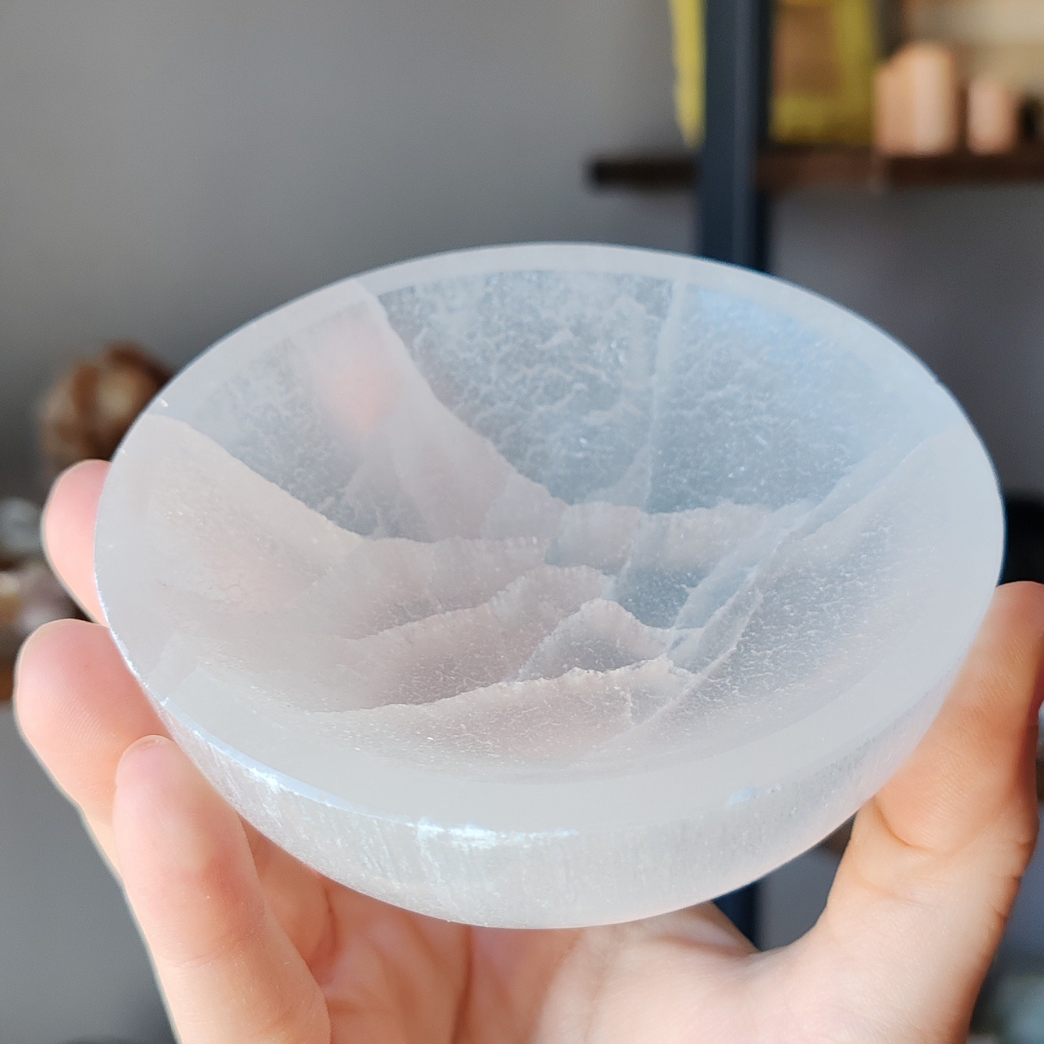 Doğal Fas Selenit – Parlak, yarı saydam dokusu ve doğal ışık yansımalarıyla her kase benzersizdir.