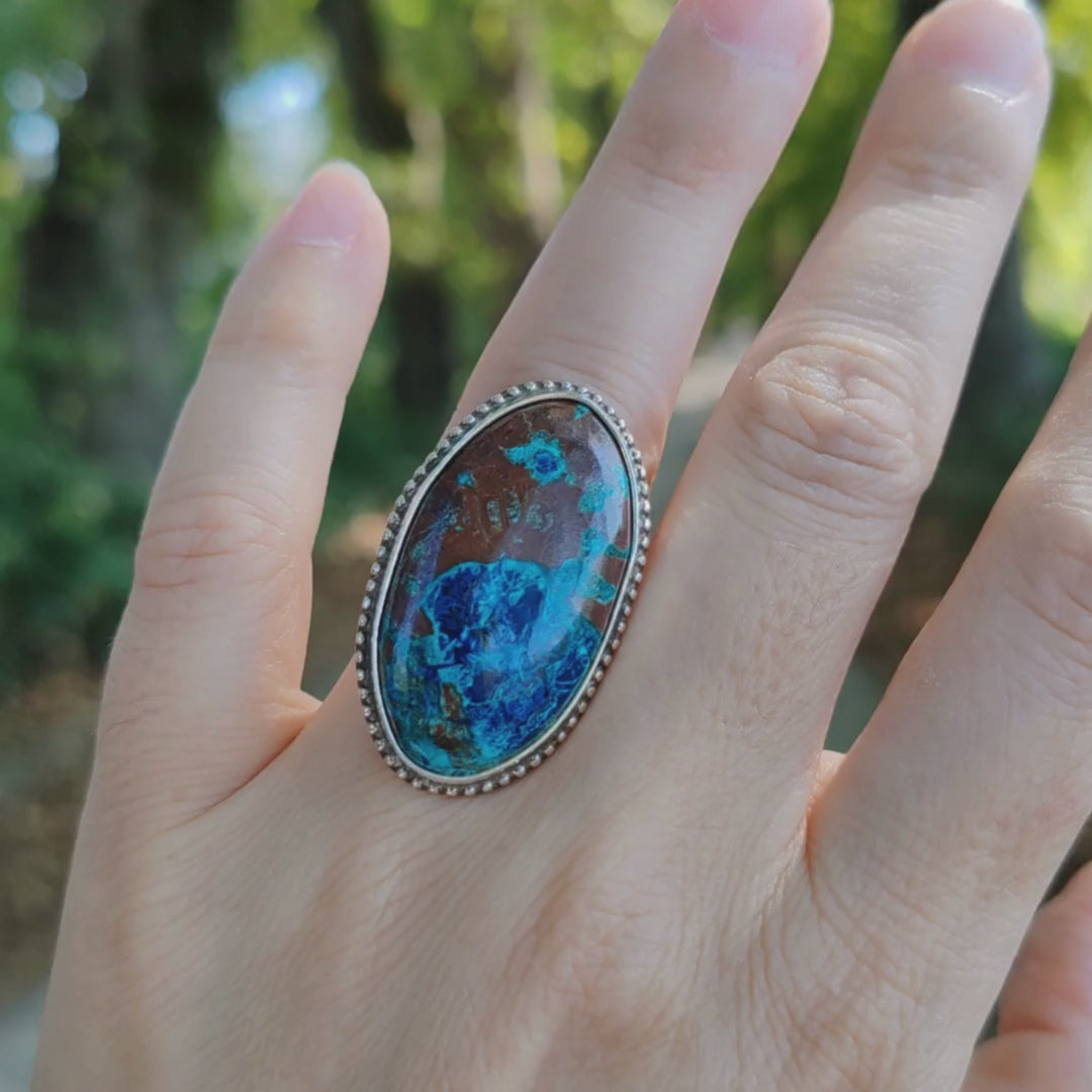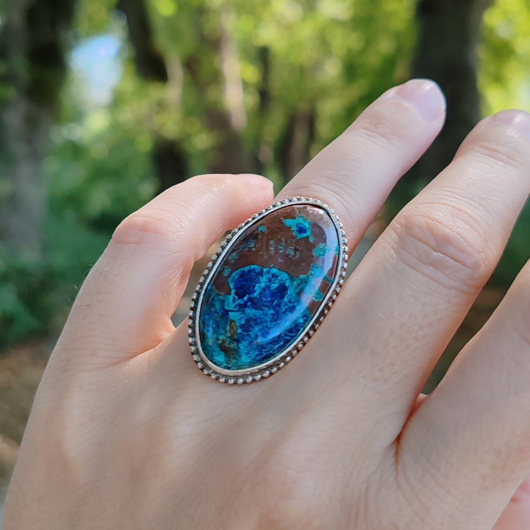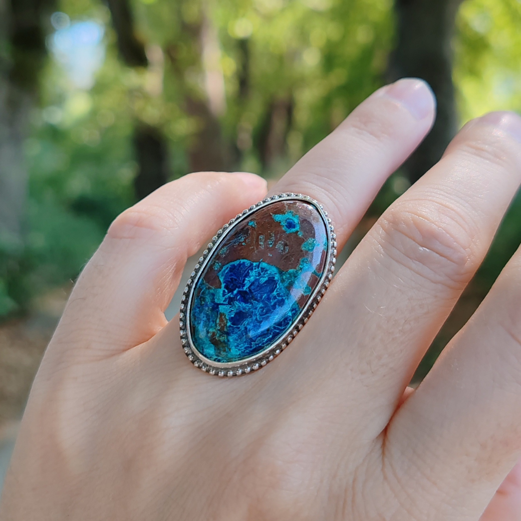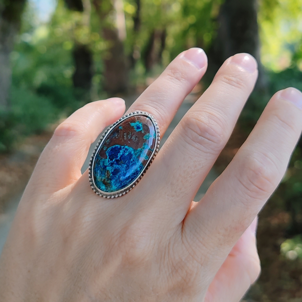 Krizokol, görünümüyle okyanus dalgalarını andıran doğal bir taştır. Her taşın renk geçişi ve desen yapısı farklıdır; bu nedenle seçtiğiniz yüzük tamamen size özel, tekrarı olmayan doğal bir parça olur.