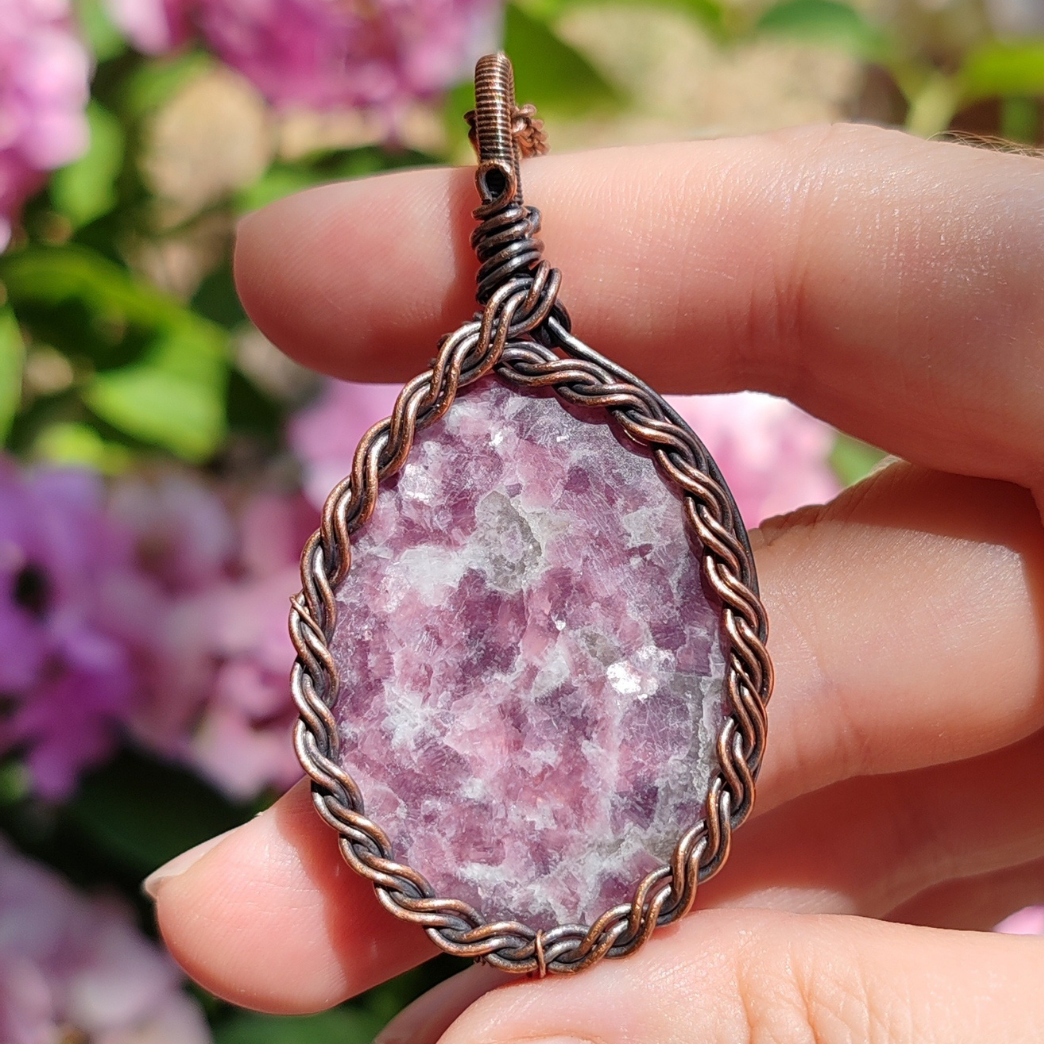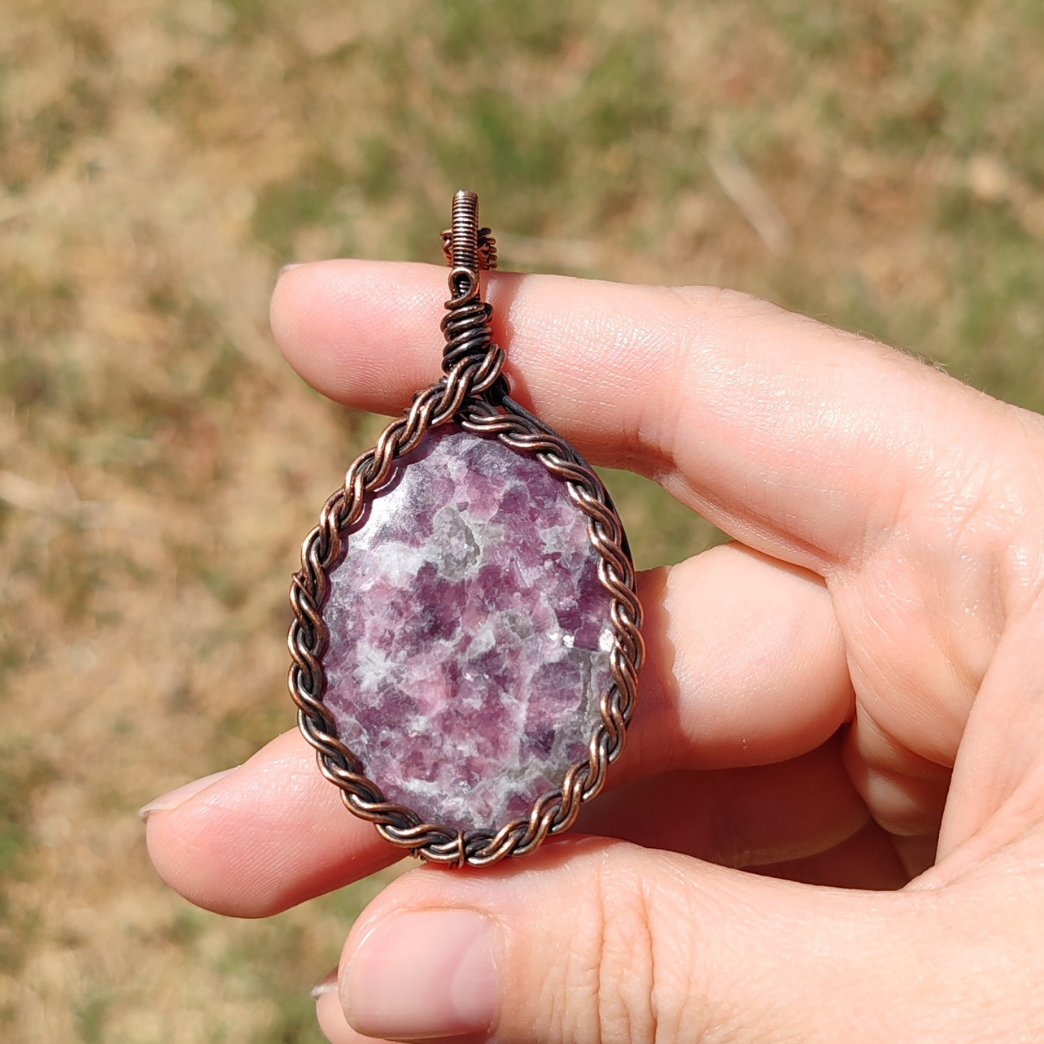 Her lepidolit taşı, doğanın kendi dokunuşu ile oluşan eşsiz desenlere sahiptir. Bakır sarma el işçiliği ile birleşince ortaya tamamen tek ve özgün bir kolye çıkar.