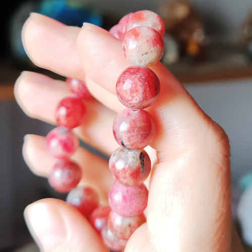 Rodonit taşları, yumuşak pembe tonlarının içinden geçen koyu damarlarla tamamen kendine özgü bir görünüm sunar. 10 mm taşlar bu kontrastın daha belirgin şekilde öne çıkmasını sağlayarak bilekliğinize eşsiz ve karakterli bir hava kazandırır.